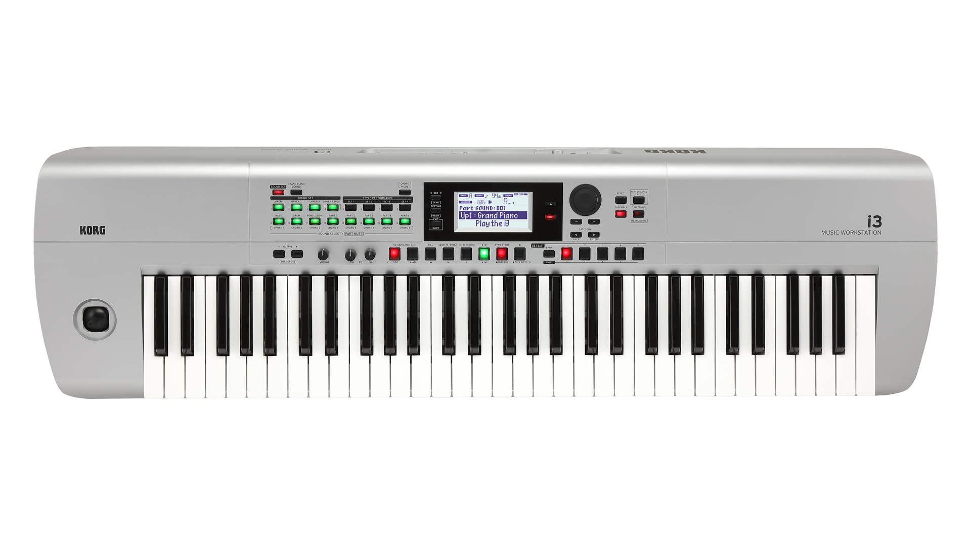 KORG i3 je plnohodnotná pracovná stanica s 61 dynamickými klávesmi štandardných rozmerov. Odozva klaviatúry je nastaviteľná pomocou troch dotykových kriviek, štvrté nastavenie dynamiku vypína. Tlačidlá Transpose menia ladenie klaviatúry v rozsahu +- dve oktávy. Profesionálny joystick umožňuje artikuláciu výšky tónu, vibráta a farby zvuku v reálnom čase počas hry. Dvojpásmový EQ (výšky a basy) upraví celkový zvuk tak, ako chceš. Všetky tlačidlá a ovládacie prvky predného panelu sú pohodlne zoskupené podľa funkcií a podsvietený LCD displej poskytuje okamžitú vizuálnu spätnú väzbu týkajúcu sa aktuálnych nastavení prístroja. Kolieskom enkodéra upravíš rýchlo hodnotu parametrov na obrazovke. Čierny pogumovaný povrch, a perforované bočnice dávajú nástroju výrazný atraktívny dizajn.
